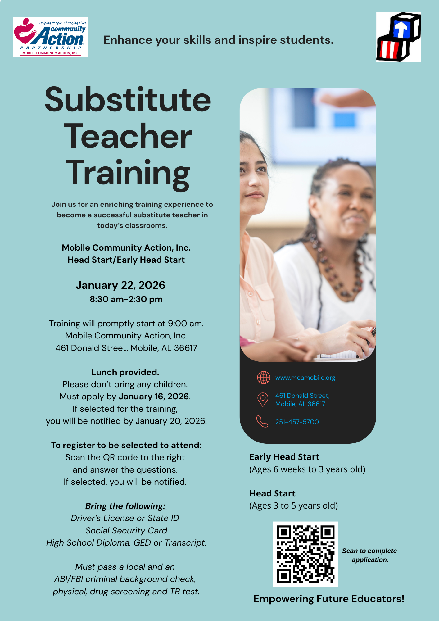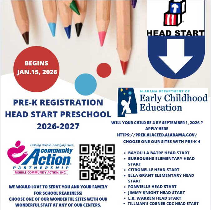 If your child will be four by September 1st, register your child for one of Mobile Community Action's State PreK (OSR) classes. Click here to see our list of PreK classes (in yellow). Come be a part of our quality school readiness program from ages 6 weeks to 4-years-old. We would love to serve your family. For more information, contact your family advocate if your child is already in our program or you can call 251-457-5700 ext. 1132.